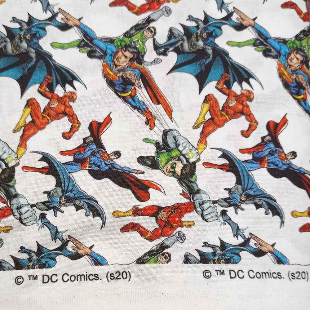 La tela de algodón de DC Comics, presenta un estampado con algunos de los personajes más famosos del comic, Superman, Batman… Producto original registrado bajo licencia © TM DC Comics (s20).