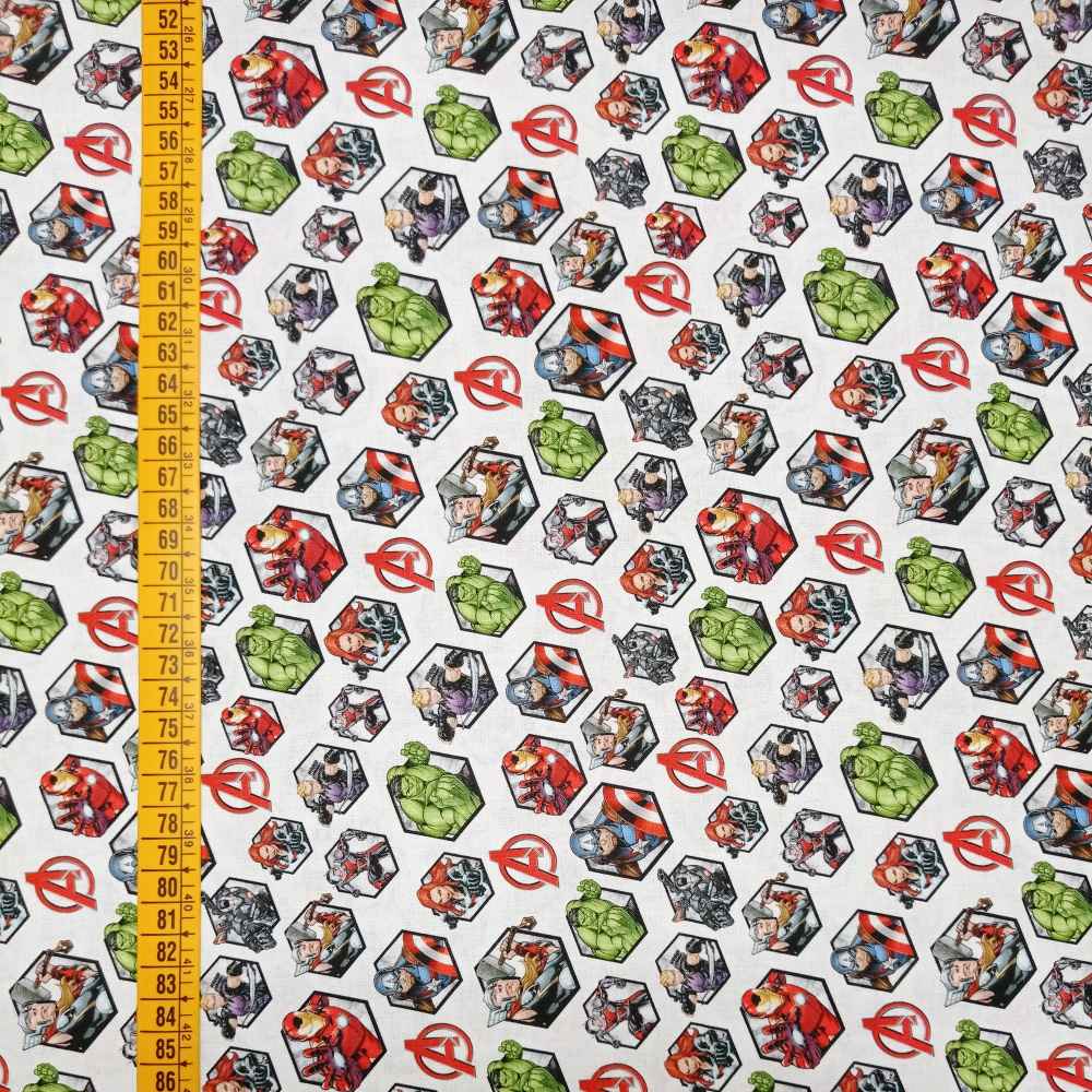 La tela de algodón de Marvel, presenta un estampado con algunos de los personajes más famosos del comic, Capitán Ámerica, El increíble Hulk … Producto original registrado bajo licencia © TM MARVEL.